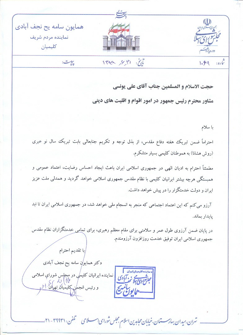 نامه قدردانی دکتر سامه یح از  مشاور رئیس جمهور در امور اقوام و اقلیت های دینی و مذهبی بابت تبریک سال نو عبری: