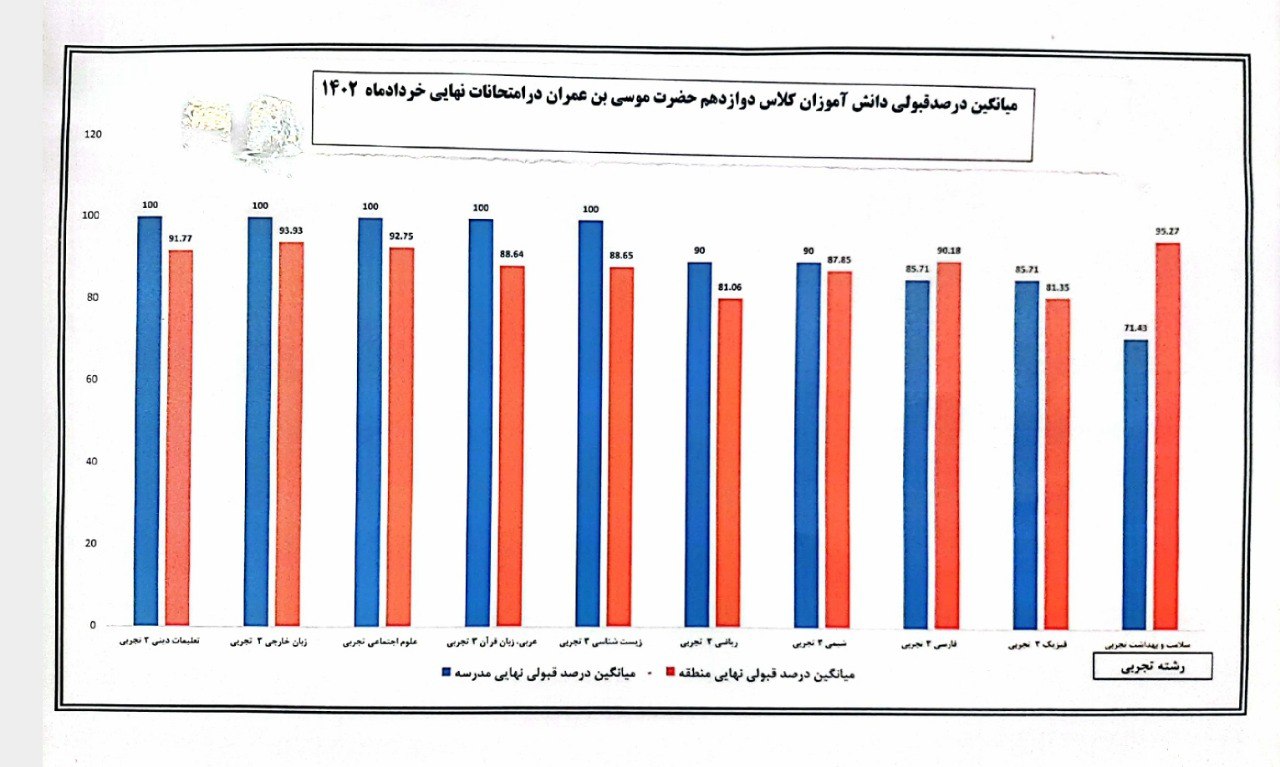 لازم به ذکر است در امتحانات نهایی و کنکور، دانش آموزان سال دوازدهم این دبیرستان خوش درخشیدند و معدل کتبی تعداد زیادی از این عزیزان بین ۱۸.۵ تا ۱۹.۸ بوده و قبولی آنها در کنکور، در رشته های بسیار خوب مهندسی و پزشکی بوده است.