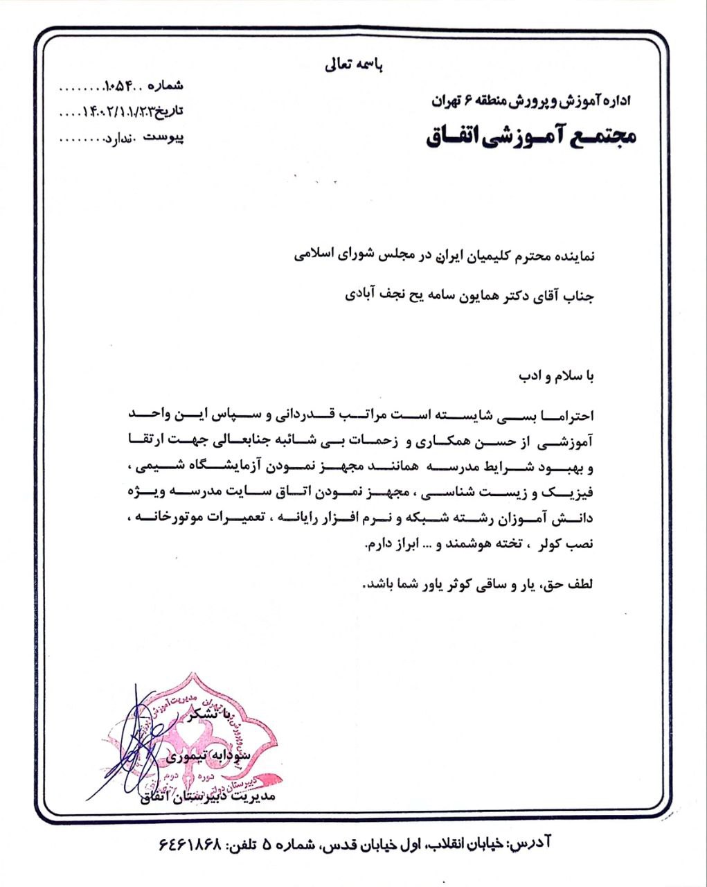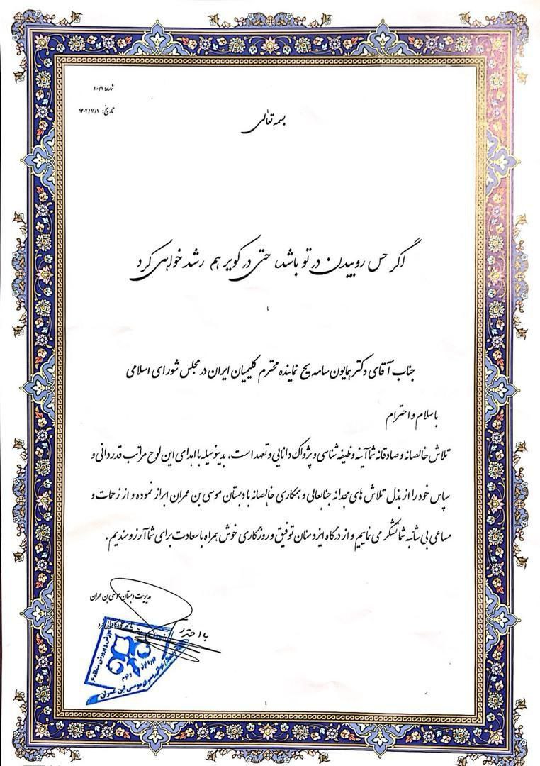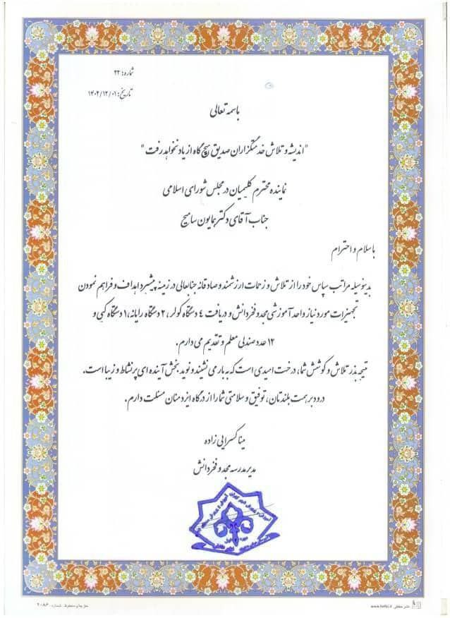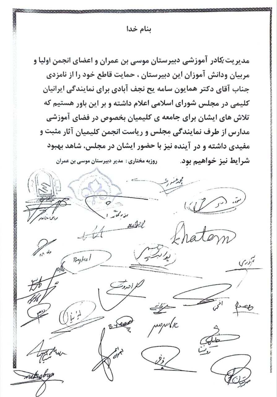 اعضای اولیا و مربیان آن مدارس نیز حمایت خود را از دکتر همایون سامه یح جهت حضور در دوازدهمین مجلس شورای اسلامی اعلام نمودند.