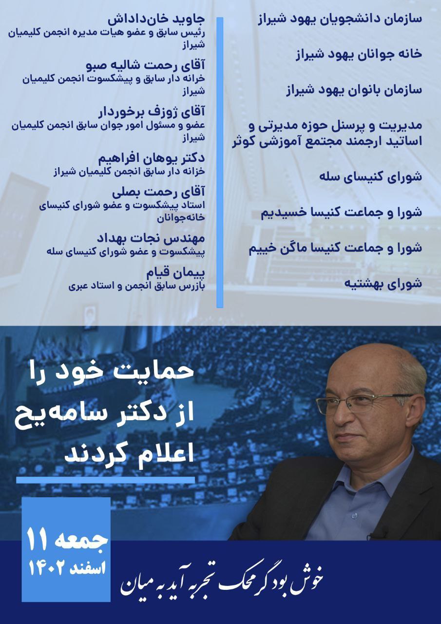 به نقل از کانال روابط عمومی دکتر همایون سامه یح نجف آبادی، جمعی از فعالان اجتماعی، اعضای فعلی و سابق هیات مدیره انجمن کلیمیان و شوراهای وابسته، نهادهای اجتماعی و برخی از شوراهای کنیساهای شیراز با توجه به شناخت از تجربه، سابقه فعالیت و حسن شهرت در انتخابات پیش رو از *دکتر همایون سامه یح* حمایت نمودند.