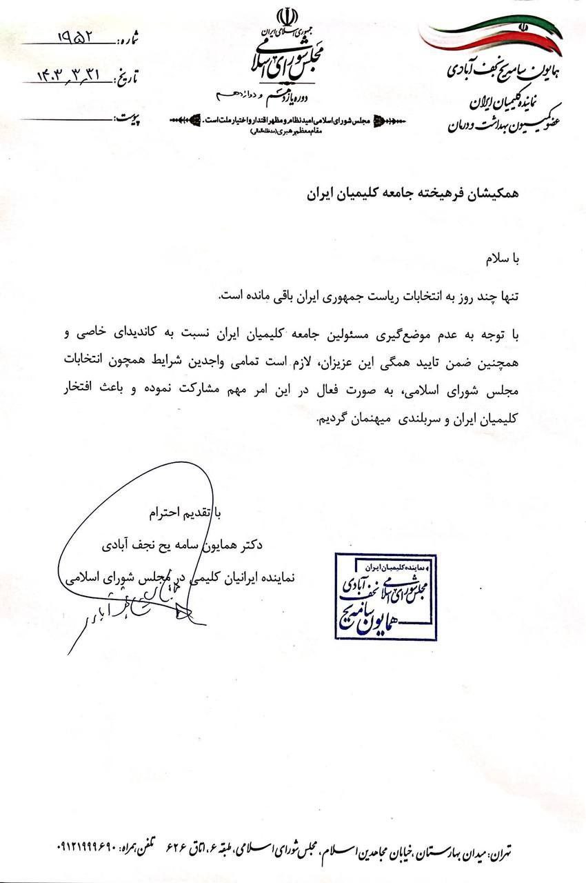 اطلاعیه نماینده کلیمیان در مجلس در خصوص شرکت جامعه کلیمیان ایران در انتخابات ریاست جمهوری، به  تاریخ ١۴٠٣/٠۴/٠٨