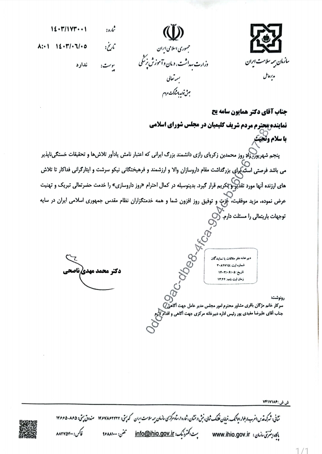 به نقل از کانال روابط عمومی دکتر سامه یح، دکتر محمد مهدی ناصحی، مدیرعامل محترم سازمان بیمه سلامت ایران، طی پیامی فرارسیدن روز داروساز را به نماینده کلیمیان تبریک گفت.